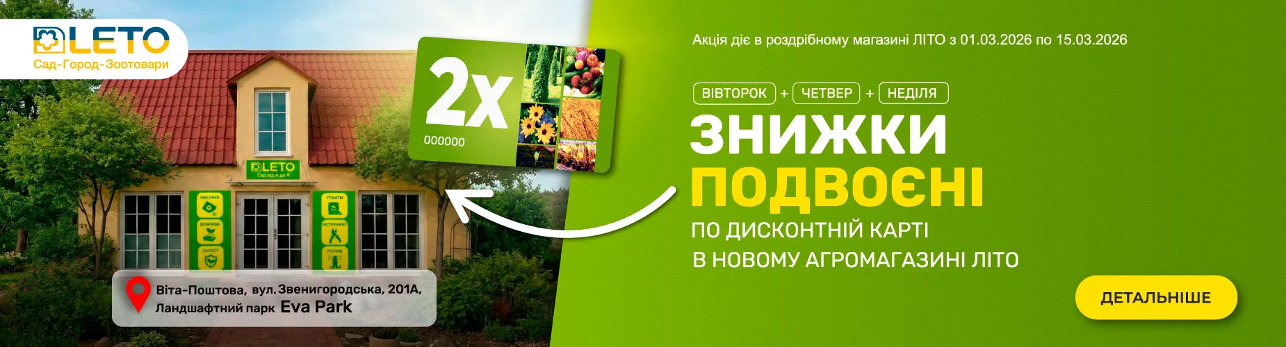 Акцію Подвійні знижки по дисконтній картці продовжено на новому магазині в с. Віта-Поштова, вул. Звенигородська 201А, Ландшафтний парк Eva Park. Акція буде діяти в вівторок, четверг і неділю до 15 березня включно!!! Встигніть купити товари з вигодою!!!
