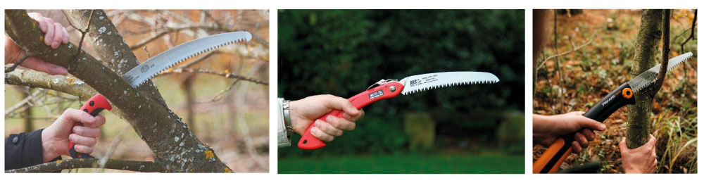 При роботі на далеких дистанціях, з драбини, зручнішими є пилки «японського» типу, з прямою або слабо вигнутою рукояткою, наприклад як АРС, а при обрізанні товстих скелетних гілок вручну кращий варіант – Фелко 640. Її перевага – можливість заміни, чим купувати нову пилку внаслідок затуплення. Доповнити довгу дугову, або пряму пилку варто невеликим складним інструментом, зручним у загущенні гілок - там рідко доводиться зрізати гілки товщі 3-4 см. Відмінним варіантом будуть АРС, Гардена, Трупер.