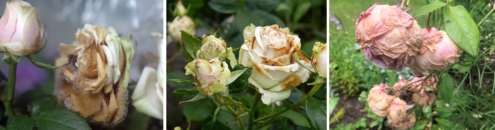 - Якщо сіра гниль вже пошкодила кущі, необхідно вжити заходів щодо її лікування, включаючи застосування фунгіцидів та швидкого видалення уражених частин рослини. Для обробки хворих троянд застосовують обприскування препаратами: Максим, Хорус, Магнікур Гард, Свіч, Амістар Голд, Топсін-М або Фундазол.