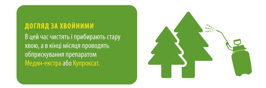 Як правило хвойні практично не вимагають догляду в жовтні. В цей час чистять і прибирають стару хвою, а в кінці місяця проводять обприскування препаратом Медян-екстра або Купроксат. Особливо воно необхідне рослинам, що пошкоджувалися шютте в поточному році.