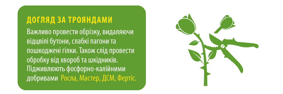 Саме час останнього догляду за трояндами перед зимою. Важливо провести обрізку, видаляючи відцвілі бутони, слабкі пагони та пошкоджені гілки. Також слід провести обробку від хвороб та шкідників, оскільки в цей період можливе поширення грибкових захворювань. Не забудьте про підживлення троянд та інших квітучих рослин фосфорно-калійними добривами, що допоможе їм накопичити сили для успішної зимівлі, наприклад Росла, Мастер, ДСМ або Фертіс. Після завершення підготовки троянд, можна починати утеплення на зиму. Використовуйте спеціальний укривний матеріал, нейтральний торф, легкий біокомпост, хвойні гілки для мульчування грунту. А от вкривати верхню частину куща, ще рано.