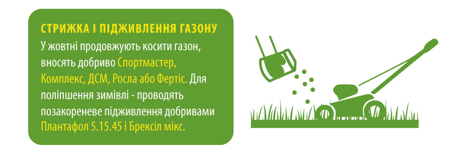 Газон в жовтні продовжують косити, вносять добриво Спортмастер, Комплекс, ДСМ, Росла або Фертіс, з розрахунку 20-25г/кв.м, проводять скарифікацію та аерацію. Для поліпшення зимівлі - проводять позакореневе підживлення трав добривами Плантафол 5.15.45 і Брексіл мікс. В кінці місяця, з похолоданням, консервують систему поливу. Для боротьби з мохом, грибами та надлишковою кислотністю ґрунту вносять Доломіт з розрахунку 30-40 г / кв. м.
