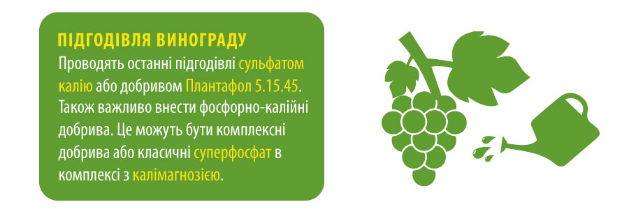 Виноград - це ще одна культура, яка потребує вашої уваги в жовтні. В цей період важливо провести обрізку винограду, видаляючи слабкі та непотрібні пагони. Укриття винограду, шляхом опускання лози починають проводити в кінці місяця. На початку місяця проводять останні підживлення сульфатом калію або добривом Плантафол 5.15.45, для прискорення дозрівання пізніх сортів перед зніманням. При несприятливих умовах, виноград, що дозріває можна обробити стимулятором Світ, для прискорення накопичення цукрів в плодах. Також важливо підживити виноград фосфорно-калійними добривами, щоб підготувати рослину до зими. Це можуть бути комплексні добрива або класичні суперфосфат в комплексі з калімагнозією.