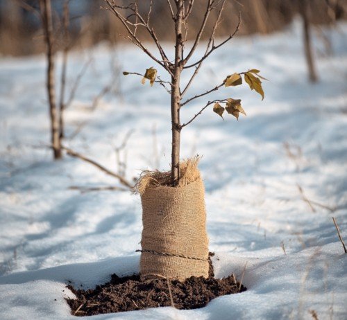 Обгортання стовбурів дерев. Мішковина або спецічна агротканина оберігає кору молодих дерев від морозних тріщин та сонячних опіків. Особливо важливо для яблуні та груші у регіонах з різкими коливаннями температури вдень і вночі.