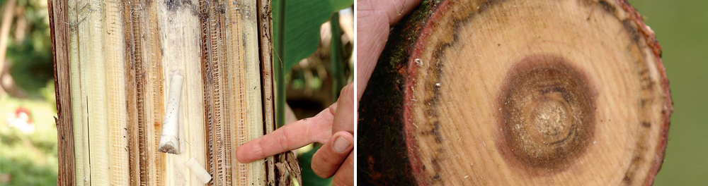 Важлива ознака при діагностиці фузаріозу — характерне коричневе кільце на зрізі уражених гілок. Воно являє собою закупорені грибницею судини.