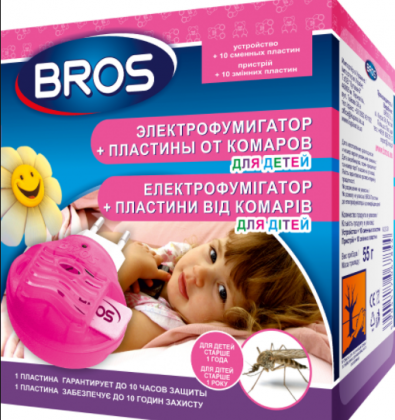 Фумігатор Bros - електричний пристрій, яке забезпечить ефективний захист від настирливих комарів. Фумігатор має багатогодинне дію, і забезпечить здоровий сон, в перебігу всієї ночі. Ретельно підібраний склад, підходить для використання в приміщеннях, де сплять дітки від 1 року, так як компоненти, які в складі пластин абсолютно безпечні для дитини.