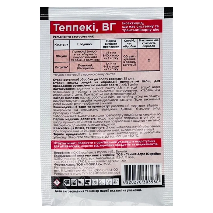 | Інсектицид Теппекі 2,8 г – революційний інсектицид із тривалою дією, що забезпечує миттєвий антифідинговий ефект і повну загибель шкідників за 2-5 днів. Його унікальна формула безпечна для екосистеми та незамінна у боротьбі зі стійкими популяціями попелиці та білокрилки. |