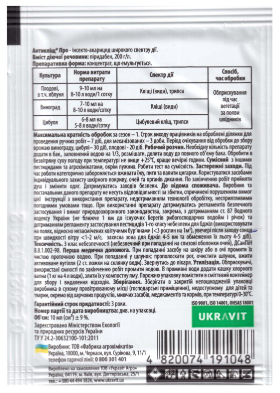 Антикліщ Про результативний як для плодових, так і декоративних культур. Має тривалий термін захисту, понад 25 днів. Абсолютно не токсичний для рослин і стійкий до опадів.