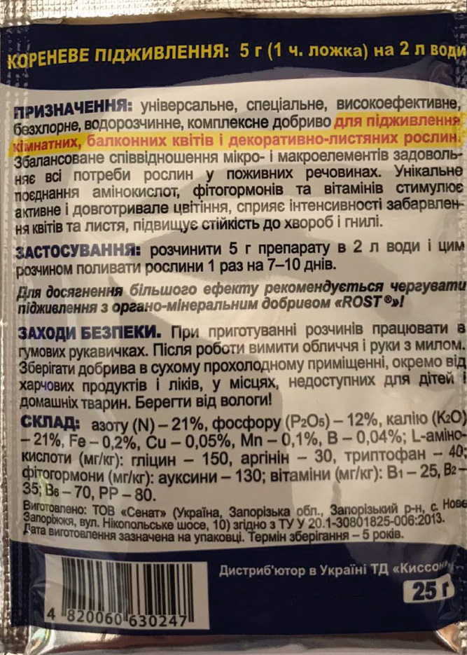 | Мінеральне безхлорне добриво Майстер-Агро, забезпечує повноцінне якісне харчування всіх видів балконних та кімнатних рослин, на різних стадіях їх розвитку. |