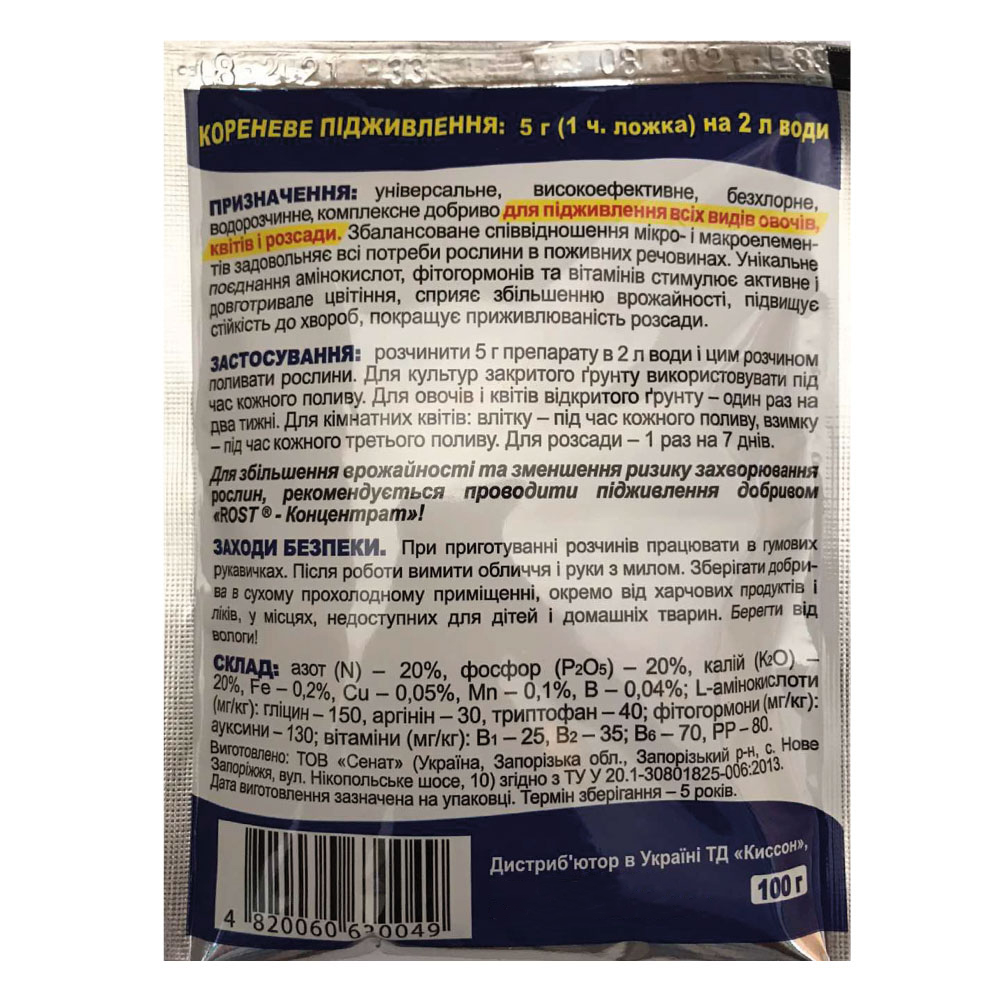 Склад: азот (N) - 20%, фосфор (P2O5) - 20%, калій (К) - 20%, В - 0,04%, Fe - 0,2%, Cu - 0,05%, Mn - 0,1%; L-амінокислоти (мг / кг): гліцин - 150, аргінін - 30, триптофан - 40; фітогормони (мг / кг): ауксини - 130; вітаміни (г / кг): В1 25, В2 - 35, В6 - 70, РР - 80.