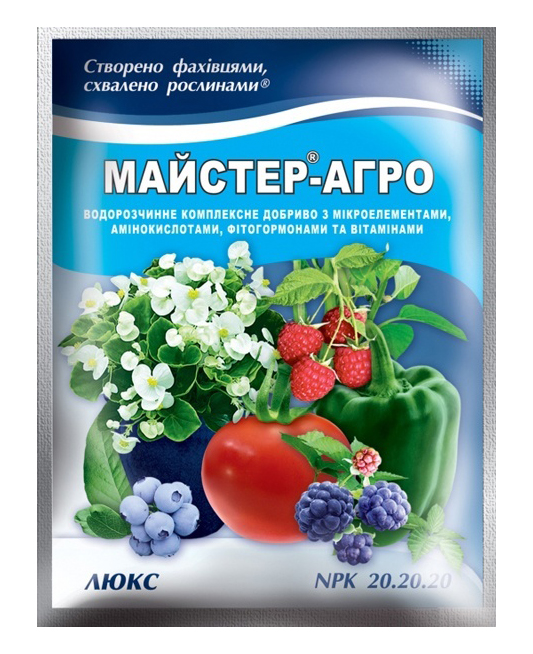 Високоефективне добриво Майстер-Агро Люкс NPK 20.20.20, застосовується для всіх видів овочів і квітів, на різних стадіях вегетації. Склад підібраний таким чином, що підгодівлю можна використовувати і для розсади.