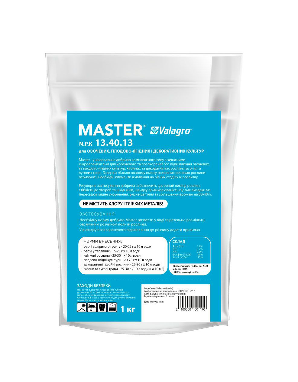 Мікроелементи, %: Fe*-0.07, Mn*-0.03, Cu*-0.005, Zn*-0.02 (*-хелати у формі EDTA).