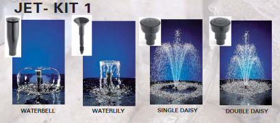 Комплект з чотирьох форсунок і адаптера для підключення до фонтанних насосів. Використовується для створення невеликих фонтанів в садових ставках.