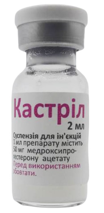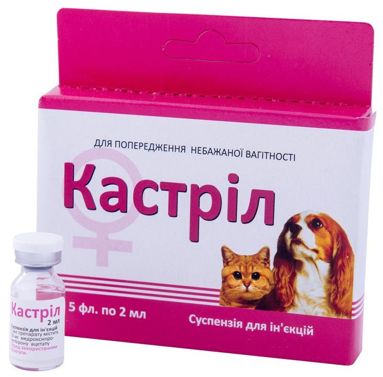 Препарат Кастрил Фарматон підходить як собакам, так і кішкам. Він являє собою гормональну суспензію, яка вводиться вихованцю підшкірно або внутрішньом'язово. Активною речовиною даного препарату є медроксипрогестерону ацетат. Це синтетичний гестаген, який блокує спеціальні гормони, що відповідають за запліднення та овуляцію. Препарат можна використовувати при лікуванні німфоманії у кішок, уявної вагітності, для попередження небажаної вагітності, а також для переривання або запобігання тічки. Даний препарат безпечний для вихованців і не викличе у них ускладнень.