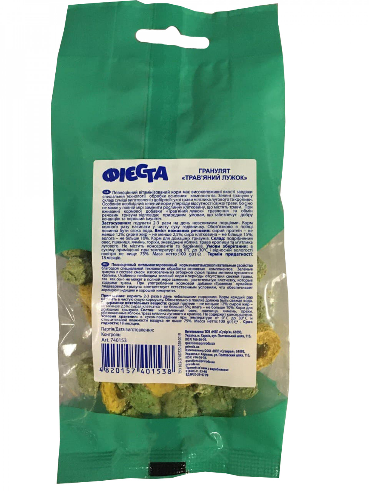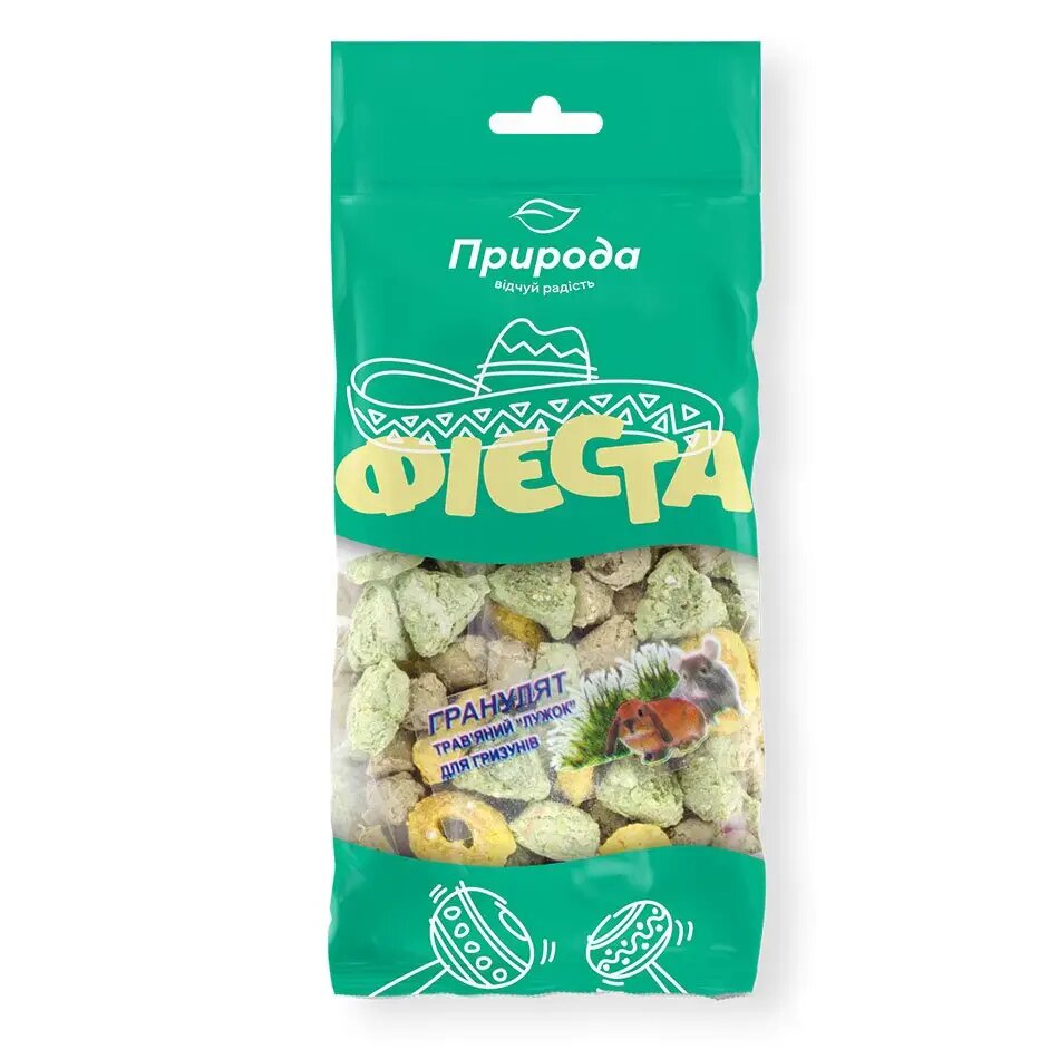 Корм Природа Фієста "Трав'яний лужок" виготовлений за спеціальною формулою та з використанням новітніх технологій обробки компонентів. Корм містить комплекс важливих вітамінів та мінералів, завдяки яким гризун зможе рости здоровим та активним. Такий корм є чудовою заміною свіжої трави, оскільки в ньому міститься рослинна клітковина. Основними компонентами корму є тонконіг луговий і кропива. Також до складу корму входять горіхи, натуральні фрукти та зернова суміш. Регулярне вживання такого корму не викличе у гризуна проблем із травленням та ШКТ. У вихованця налагодиться обмін речовин, покращиться стан та зовнішній вигляд вовни, а також зміцниться імунітет. Цей корм ідеально підходить для всіх видів декоративних гризунів. Він абсолютно безпечний, і не викличе подразнень чи алергічних реакцій.