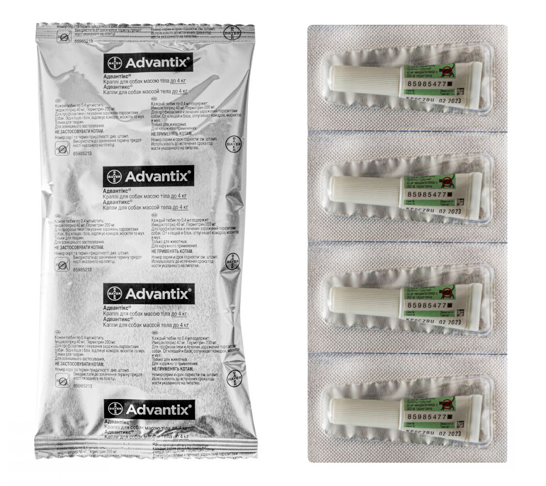 Краплі на холку Advantix від Bayer для маленьких порід, вагою до 4 кг, є швидкодіючим і високоефективним засобом, яке забезпечує надійний захист від кліщів, бліх, комарів, мух і москітів. Засіб надає не тільки профілактичну властивість, а й використовується для лікування блошиного дерматиту і знижує ризики захворіти бабезіозом та ін.