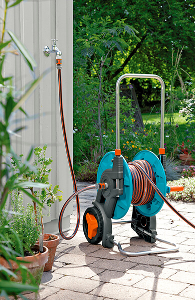За допомогою набору з'єднань Gardena котушка для шлангів або візок для шлангів можуть бути приєднані до джерела води. Шланг може бути легко з'єднаний з оригінальною системою фітингів Gardena, а саме за допомогою стандартних з'єднувачів шлангів (арт. 915) і з'єднувача з краном (арт. 901). Шланг має стандартну довжину 150 см і шланг FLEX з діаметром 13 мм (1/2 ") з тиском на розрив в 25 Бар. Для легкого і швидкого з'єднання котушки для шлангів або візки для шлангів з джерелом води.