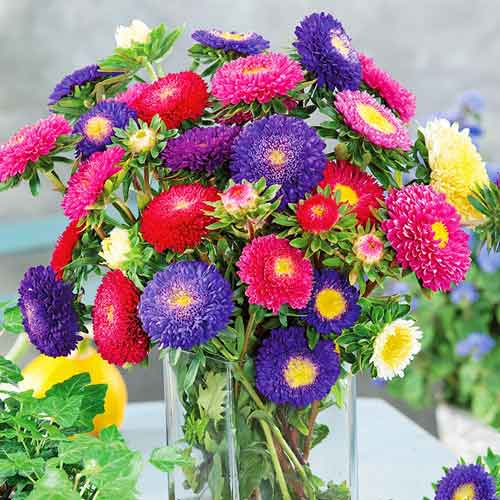 Суцвіття махрові, плоско-округлої форми, діаметром 5-6 см, яскравих кольорів з жовтою серединою. З однієї рослини можна отримати великий букет або зрізати квіти по черзі за часом цвітіння.