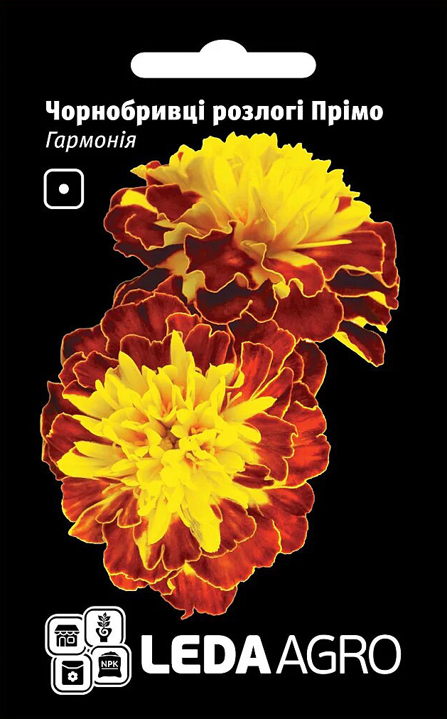| За допомогою насіння Прімо Гармонія Hem Zaden ви зможете виростити дуже красиві однорічні чорнобривці. Вони мають великі суцвіття червоно-жовтого забарвлення. Висота рослин не перевищує 20 см. Вони стійкі до посухи та негоди. Також цей сорт невибагливий до вологи та ґрунту. Квіти ідеально підходять для вирощування на клумбах та рабатках. Їх можна використовувати для групової посадки. |