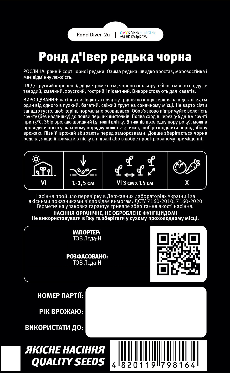 | Насіння Ронд дІвер Graines Voltz Leda Agro - ідеальний вибір посадкового матеріалу, якщо ви хочете виростити смачну і корисну редьку. Цей сорт можна культивувати як ранньою весною, так і пізнім літом. Редька добре переносить морози, швидко росте і відрізняється чудовою лежкістю. У неї щільні округлі коренеплоди з відмінною чорною шкіркою і гострою м'якоттю. Така редька підійде як для кулінарії, так і для тривалого зберігання. |