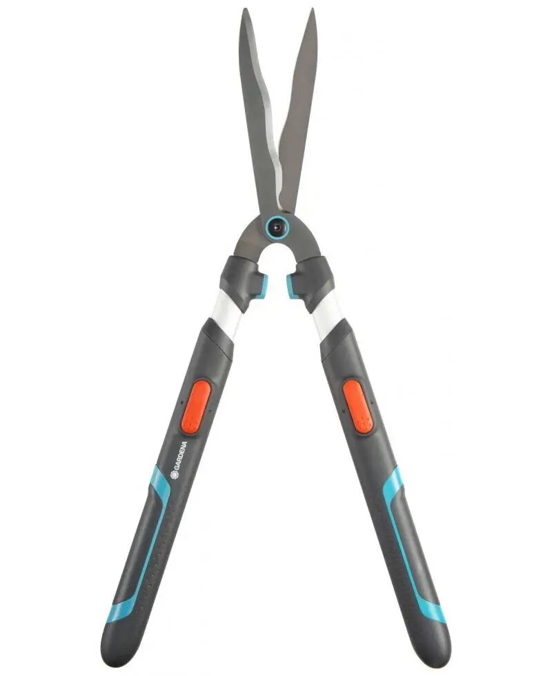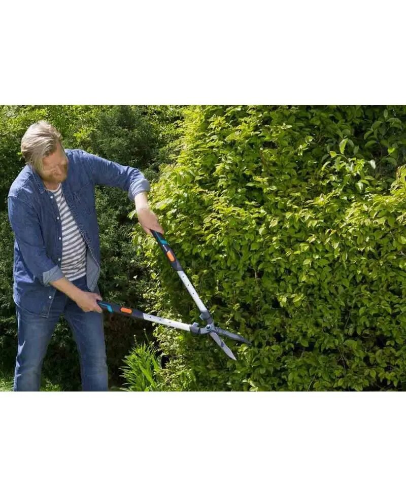 Ножиці Gardena TeleCut оснащені довгими телескопічними ручками. Завдяки такій особливості довжину інструменту можна регулювати в межах 70-90 см. Ви зможете легко дістатися як до верхніх ділянок живоплоту, так і до нижніх. Лезо даного інструменту має не пряму, а хвилясту форму. Це дозволяє надійно фіксувати гілки рослин між лезами, а також полегшує процес обрізання. Зрізи від таких ножиць виходять дуже рівними, гладкими та акуратними. Інструмент має невелику вагу у порівнянні з аналогами. Мінімізувати вагу вдалося шляхом виготовлення ручок з алюмінію. При цьому вони неймовірно міцні та витримують великі навантаження. Робоча частина ручок покрита пластиковими вставками, що забезпечує гарне зчеплення з долонями, і не дає ножицям вислизати з рук. Між ручками розташовуються опорні амортизатори, які допомагають гасити удари при різкому схлопуванні ручок. Такі ножиці ідеально підходять не тільки для підстригання кущів, але і для обрізання невеликих гілок дерев. Леза стійкі до деформації та витримують великі навантаження. До них не липне кора, листя, смола та інше сміття. Ножиці дуже довговічні та зносостійкі. Їх дуже просто транспортувати й зберігати. Вони не займають багато місця і не вимагають особливого обслуговування.
