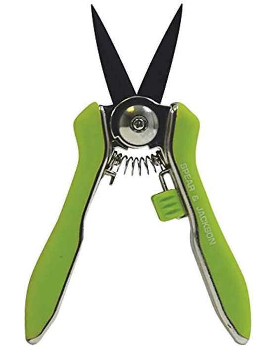 Ножиці 56418G Spear & Jackson завдяки компактним лезам завдовжки 53 мм ідеально підходять для обрізки квітів, тонких зелених гілок, винограду та плодів. Робоча частина ножиць виконана з міцної вуглецевої сталі SK-5, стійкої до корозії, механічних ушкоджень і негативних чинників довкілля. Ручки інструменту виготовлені з литого алюмінію і покриті протиковзкими накладками. Така конструкція дає змогу ножицям зручно лежати в долоні, і не дає їм вислизати з руки під час роботи. М'який хід лез і ручок забезпечує за допомогою якісної амортизаційної пружини. А завдяки надійному фіксатору ви зможете безпечно транспортувати ножиці та зберігати їх у будь-якому зручному місці.