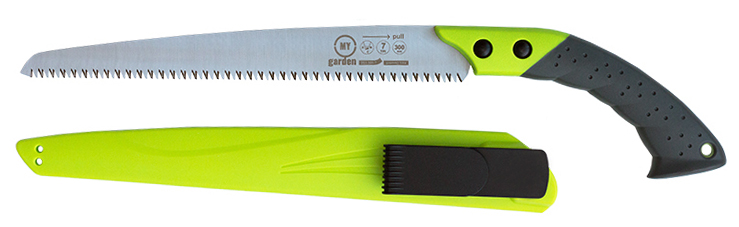 Садова пила в чохлі з ергономічною двухкомпонентной ручкою, яка надійно зафіксована двома гвинтами.