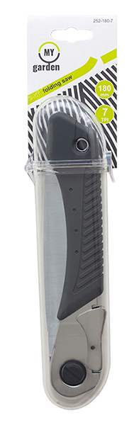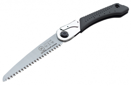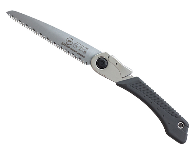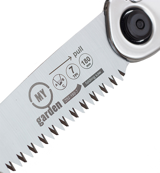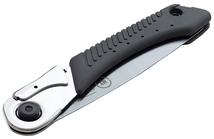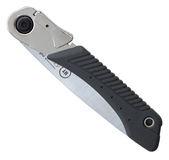 Складне лезо із загартованої сталі чудово пиляє матеріали. Засувка на ручці не дозволить лезу раптово складеться. Тригранна заточка зуба зворотної спрямованості полегшує роботу з гілками.
