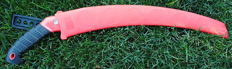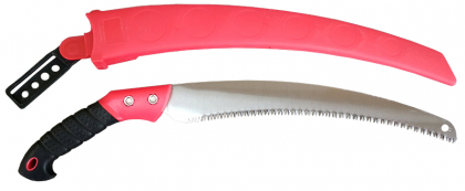 Садова ножівка в чохлі з ергономічною двухкомпонентной ручкою, яка надійно зафіксована двома гвинтами. Тригранна заточка зуба зворотної спрямованості полегшує роботу з гілками. Загартування зубів збільшує ресурс інструменту. Ручка має отвір для зберігання пили в гаражі або коморі.