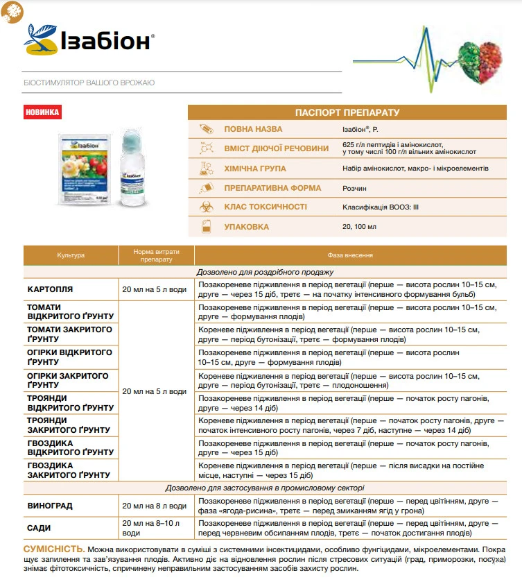 Стимулятор росту Ізабіон Syngenta складається з амінокислот і пептидів, які легко засвоюються рослинами. Вміст амінокислот у препараті становить 62,5%, що забезпечує високу біологічну активність. Стимулятор не тільки сприяє активному розвитку культур, а й допомагає рослині долати стреси, спричинені градом, посухою, приморозками, хворобами та шкідниками, хімічними препаратами, засоленням ґрунту. Препарат сумісний з більшістю пестицидів і добрив, що робить його універсальним засобом для використання в різних системах агротехніки.