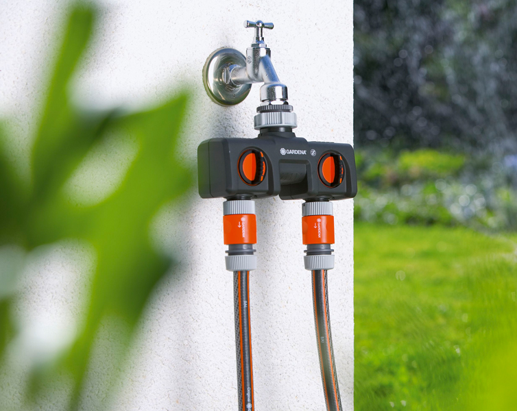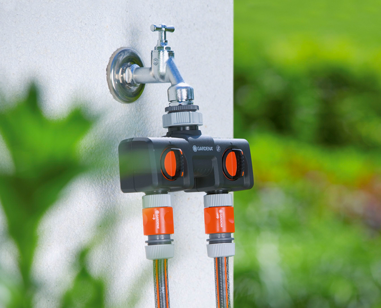 Розподільник 2-х канальний дозволяє одночасно підключати два поливальних інструмента до одного крану.