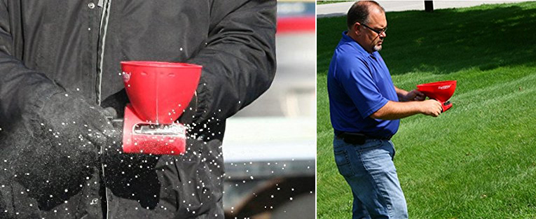Призначений для невеликих рук з дизайном совка, пристроєм можна набирати суміш з мішків, тому вам не потрібно торкатися до препарату, який ви розсипали. Маючи ємність 1,8 літра, пристрій забезпечує швидку роботу з обробки потрібних ділянок або нанесення реагентів на тротуари взимку.