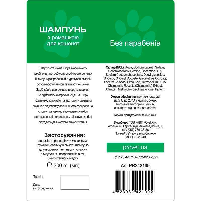 За допомогою шампуню ProVET З ромашкою для кошенят ви зможете швидко та ефективно повернути доглянутий вигляд вашому маленькому вихованцю. Цей шампунь підходить для частого купання. Він не сушить шкіру і не чинить агресивного впливу. Натомість він захищає шкіру кошеня від негативного впливу навколишнього середовища, та сприяє її відновленню за наявності травм. Шампунь справляється з будь-якими запахами та забрудненнями. Він не викликає подразнень та алергічних реакцій.