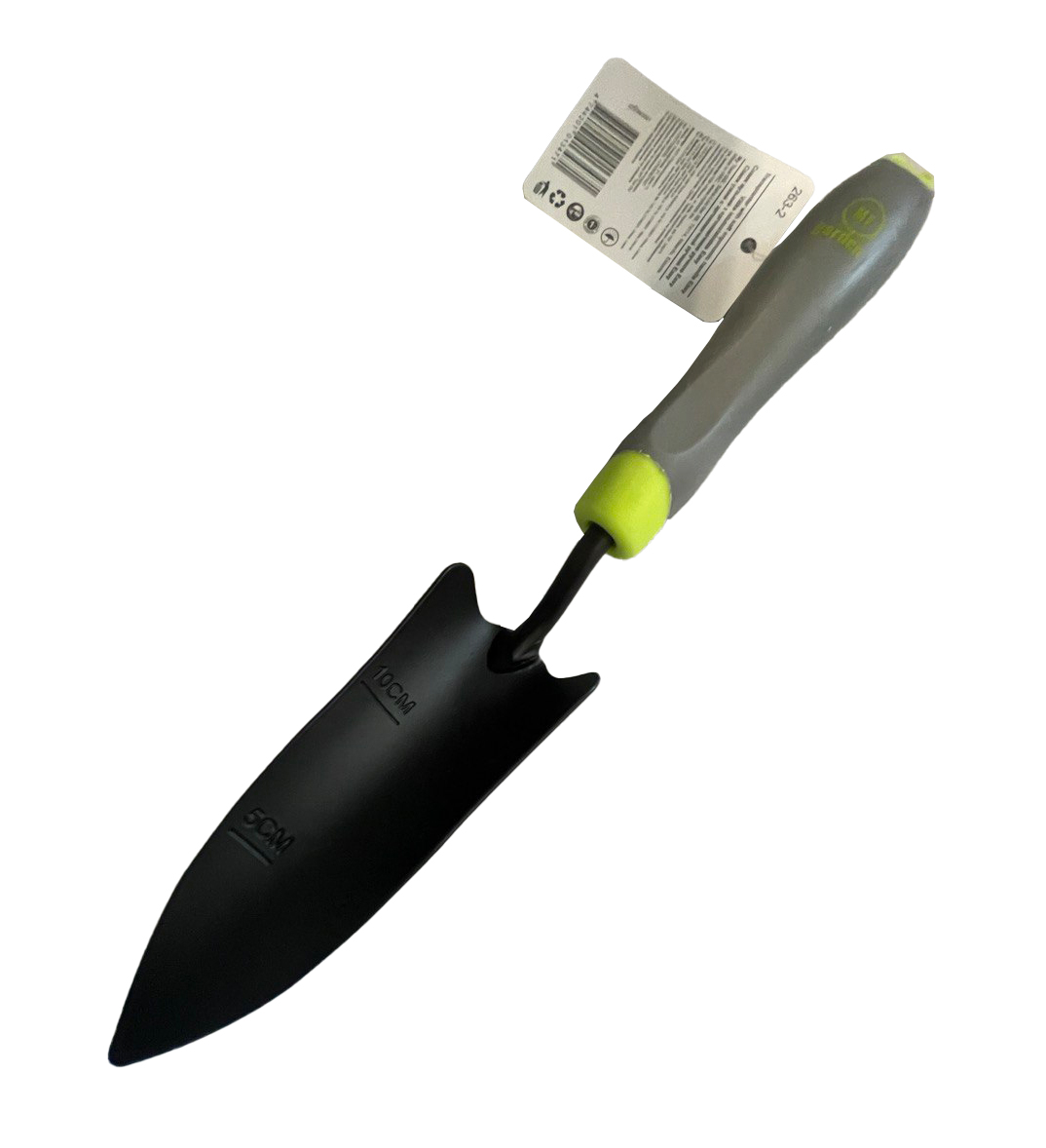 Ручна садова лопатка із високоякісних матеріалів. З мірною шкалою на робочій частині. Стійка до деформації та корозії, і не ковзає в долоні під час роботи. Ширина робочої частини – 6 см, а довжина – 15 см. Загальна довжина лопатки становить 33 см.