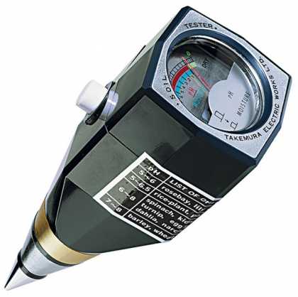 Високоточний рН-метр японського виробництва. Прилад дозволяє миттєво виміряти рівень рН грунту. Він не вимагає джерел живлення, тому що працює за принципом різниці потенціалів (генерує власну електроенергію в контакті з грунтом).