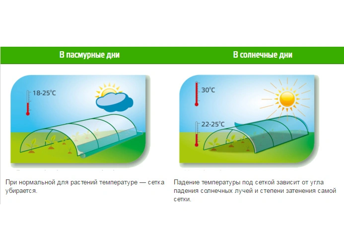 Сітка призначена для затінення теплиць і овочів відкритого грунту в усіх регіонах України, а також затінення альтанок, балконів, майданчиків на присадибних ділянках. На присадибних ділянках за допомогою затеняющей сітки можна створювати комфортні, захищені від сонця ігрові зони для дітей, затінювати альтанки, автомобільні стоянки.