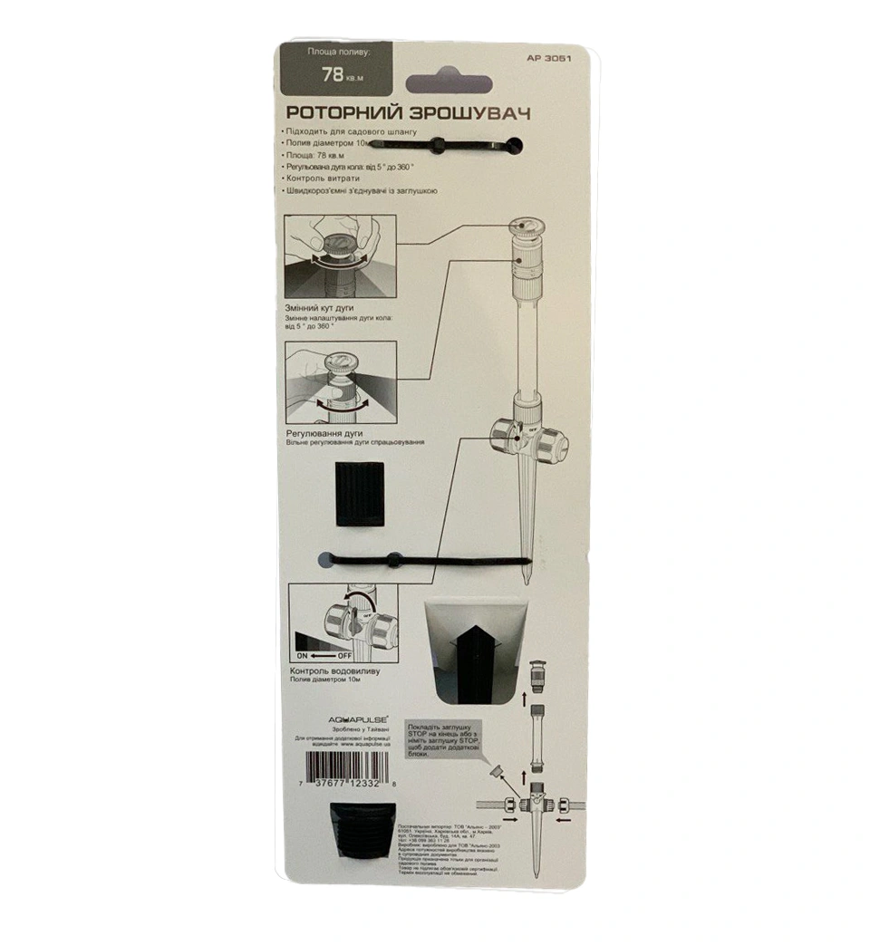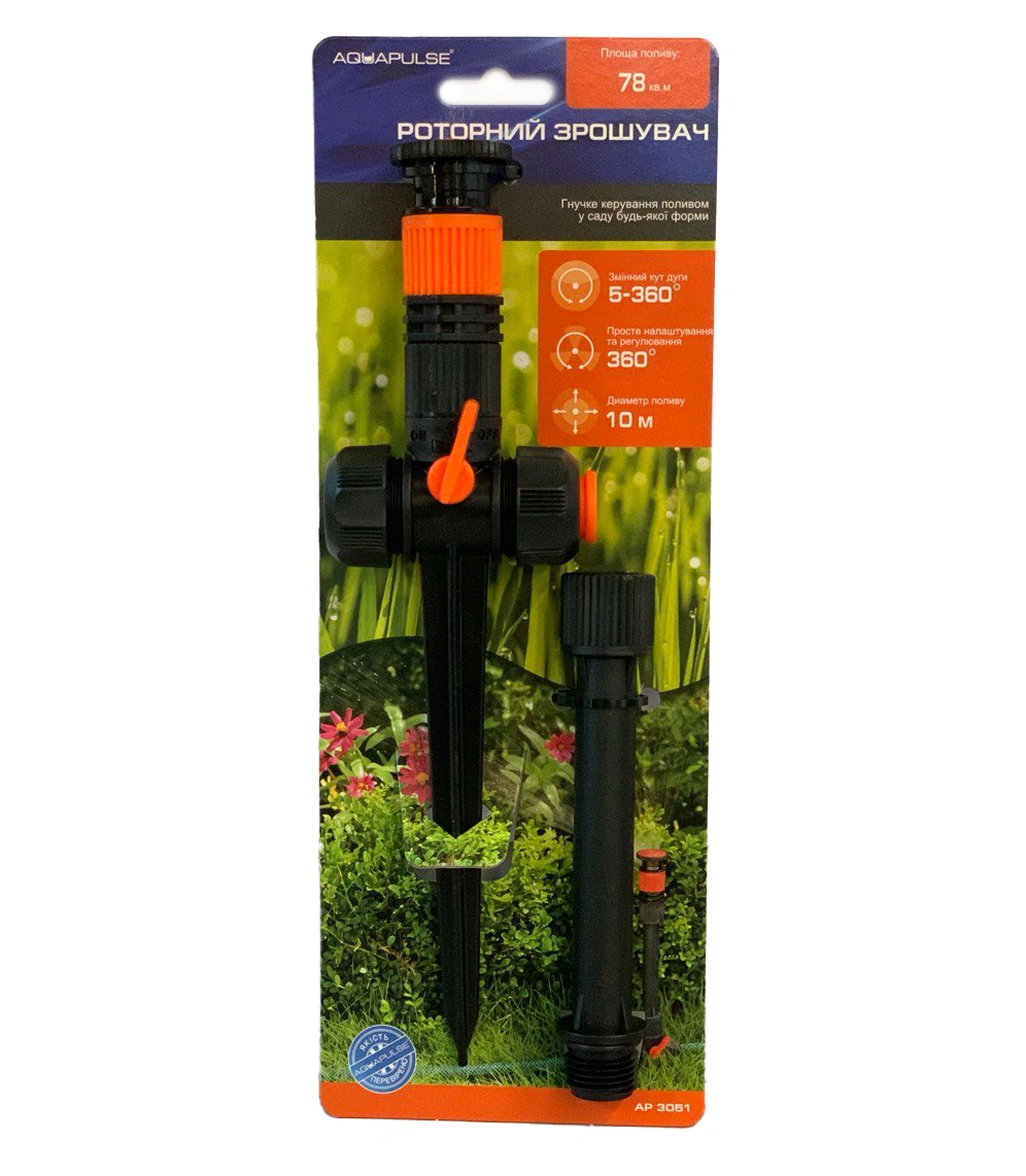 Зрошувач Aquapulse AP 3051 виготовлено з міцного пластику, стійкого до механічних пошкоджень і ультрафіолетового випромінювання. Діаметр поливу такого зрошувача становить 10 метрів, сектор зрошення можна налаштувати від 5° до 360°. Конструкція оснащена системою плавного повороту, що знижує навантаження на механізм і подовжує термін служби. Цей зрошувач встановлюється на стандартний шток або базу системи поливу, підключається через швидкознімне з'єднання. Вбудований фільтр запобігає засміченню форсунок, а спеціальна конструкція сопла забезпечує рівномірне розпилення води. За допомогою такого зрошувача ви зможете забезпечити рівномірний полив ділянки площею до 78 кв. м.