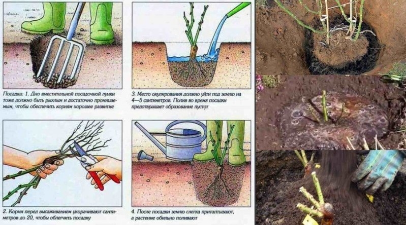 На участке, где раньше росли розы, обязательно готовят посадочные ямы глубиной не менее 40-45 см и диаметром в 60-80 см, заполняя их почвосмесью или грунтом из другого участка сада. Такие же ямы, обильно заправленные минеральными и органическими удобрениями, желательно готовить при посадке одиночных кустов. Яма для розы должна быть не очень глубокой, но иметь большой диаметр. При организации посадочной ямы необходимо вилами разрыхлить дно ямы. Это не только улучшает дренаж почвы, но и способствует уменьшению четкости перехода между плодородной прикорневой зоной и более бедным грунтом участка. Такая процедура стимулирует рост корней растения за пределы посадочной ямы.