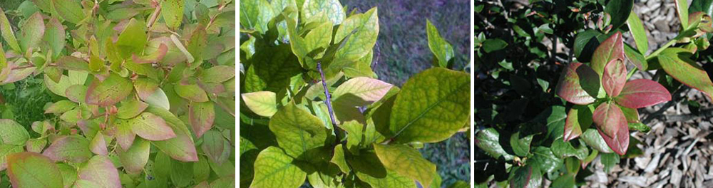 Дефицит таких элементов питания, как фосфор, магний и железо, приводят к изменению цвета листьев на красные в весенне-летний период. При дефиците железа, лист голубики характерно приобретает розовый цвет только на краях. Самое сильное изменение цвета листа происходит именно при недостатке фосфора. При этом листья полностью приобретают темно-красный цвет, начиная сверху куста. Дефицит магния сопровождается покраснением от края листа, распространяющегося в межжилочные промежутки. Особенно распространено явление в летний период во время засухи.