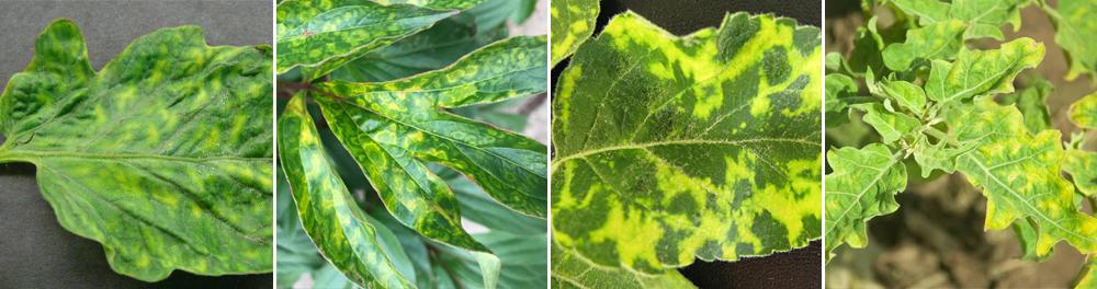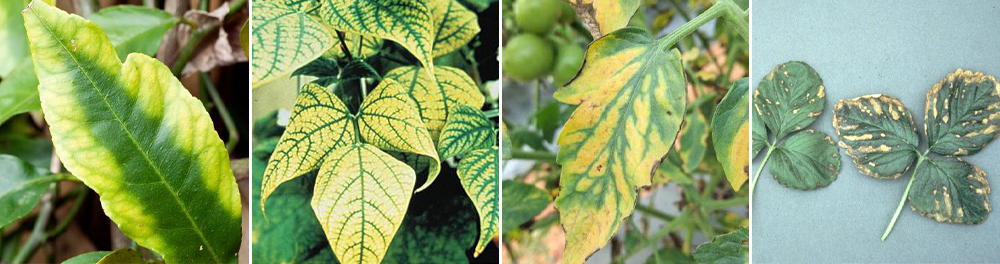Хлорозы, характеризующиеся пятнами на листьях растений, могут вызываться вирусами. Как правило, пятна при этом мозаичной или неуклюжей формы могут формировать обесцвеченные полосы. Растение угнетается, хуже растет, может наблюдаться внезапное увядание отдельных побегов и целых растений. Вирусные заболевания часто завозятся из питомников и садовых центров и могут распространяться с сосущими вредителями.
