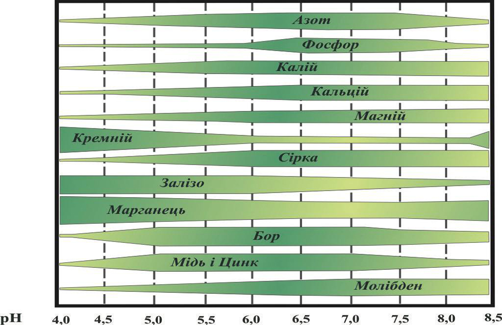 Элементы питания растений, как макро, так и микроэлементы, усваиваются растениями из почвенных растворов. Их растворимость зависит от кислотности этого раствора.