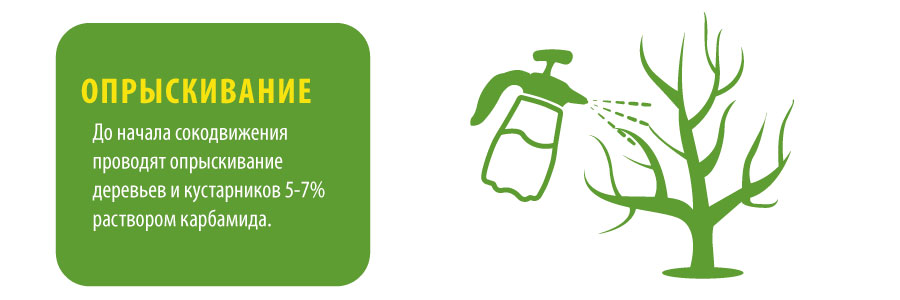 До начала сокодвижения проводят опрыскивание деревьев и кустарников 5-7% раствором Карбамида. Это одновременно и азотная подкормка растений, необходимая им в начале вегетации, и способ уничтожения возбудителей грибковых и бактериальных болезней.
