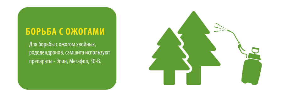 Для борьбы с ожогом хвойных, рододендронов, самшита используют препараты - Эпин, Мегафол, 30-в. О том, как это сделать, читайте в статье.