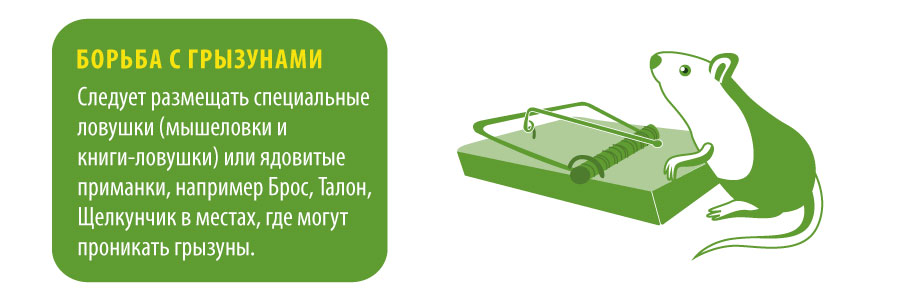 Во-вторых, следует размещать специальные ловушки (мышеловки и книги-ловушки) или ядовитые приманки, например Брос, Талон, Щелкунчик в местах, где могут проникать грызуны. Кроме того, эффективным будет использование натуральных средств, таких как разложенная мята или лаванда, которые отпугивают мышей своим запахом. Не забывайте регулярно осматривать урожай на наличие повреждений, чтобы выявить признаки активности грызунов.