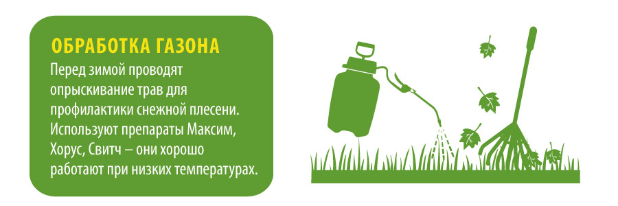 Обязательно убирают листья с газона легкими веерными граблями. Перед самой зимой производят опрыскивание трав для профилактики снежной плесени. Используют препараты Максим, Хорус, Свитч – они хорошо работают при низких температурах.