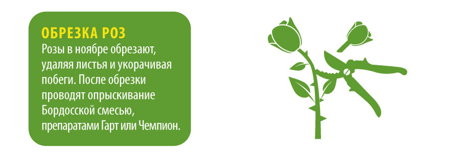 Одной из основных работ ноября является санитарная обрезка плодовых деревьев и кустарников, позволяющая удалить сухие, поврежденные ветки и предотвратить распространение болезней. Последнее искореняющее опрыскивание проводят после практически полного опадания листьев для профилактики грибковых заболеваний и появления вредителей, которые могут активизироваться весной. В этот период для обработки применяют концентрированный раствор из препарата на основе меди (медный купорос, Медян экстра, Гарт или бордосская смесь). Через некоторое время опрыскивают баковой смесью, включающей карбамид, Брунька и Препарат 30-Б или 30-Д. Проводят борьбу с лишайниками, обрабатывая штамбы и ветви 5% раствором железного купороса.