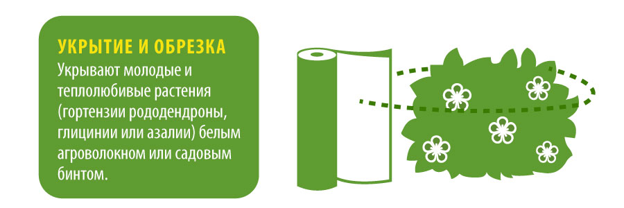 Укрывают молодые и теплолюбивые растения, такие как гортензии, рододендроны, глицинии или азалии, обматывая их белым агроволокном или садовым бинтом. Приствольные круги покрывают специальными матами или торфом, что особенно важно для молодых и свежевысаженных растений.