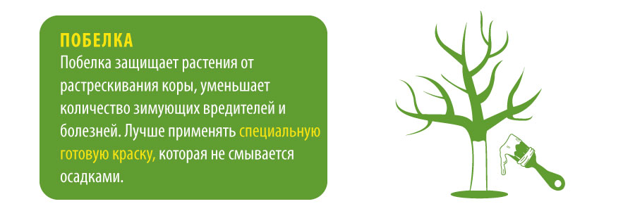 Октябрь – время завершения активного сезона для большинства плодово-ягодных культур. Основные работы направлены на подготовку к зимнему периоду, чтобы обеспечить успешную зимовку и хороший урожай в следующем году. Важно осуществить обрезку плодовых деревьев – удаление больных, сухих и поврежденных ветвей. Это поможет сохранить силы растения и будет способствовать лучшему плодоношению в следующем году. Побелка растений под зиму обязательна. Она защищает растения от растрескивания коры (читайте статью) и уменьшает количество зимующих вредителей и болезней на стволе и ветвях. Лучше применять специальную готовую краску, что не смывается осадкам.
