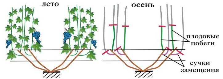 Летом из верхних трех почек винограда второго года после посадки вырастают побеги, которые подвязывают к опоре. Средний - вертикально, два нижних постепенно опускают, осенью закрепляя на горизонтальных проволоках. Начинать опускать побеги нужно примерно через месяц активного роста, делая это постепенно, в 3-4 приема. Все побеги ниже трех верхних прищипывают над вторым листом, что способствует усилению лозы.