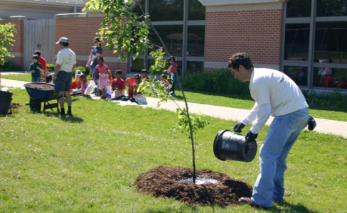 Для семечковых культур, посадочная яма должна быть – 1х1х1 м, для косточковых и большинства декоративных лиственных деревьев - 70х70х70 см. В яму закладывают: 200-300 кг органических удобрений, например компоста, или раскисленного торфа, также 0.5-1 кг Суперфосфата, 200-300 гр калийных удобрений (Калимагнезия или Сульфата калия), или 200-300 гр Нитроаммофоски. Удобрения перемешивают с почвой (из верхнего слоя), затем из почвы создают конусообразный холмик (по размеру корневой системы саженца), и забивают опорный кол. Кол должен находиться в 5-7 см от ствола саженца, а по высоте доходить до нижних ветвей дерева.